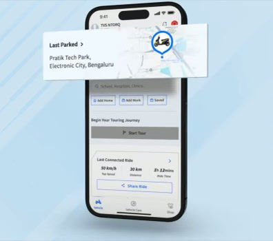 - Vehicle Live TrackingTop variant of TVS NTORQ 150 comes with 5” Full digital TFT cluster with additional features like Alexa integration, Smart watch integration, Vehicle Live tracking, and 4 way Navigation switches